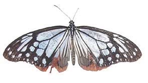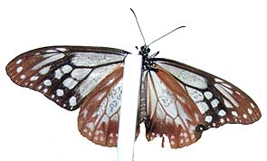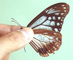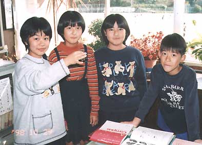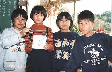 1998年8月23日に長野県松本市蝶ヶ原林道(美ヶ原)で標識・放蝶したアサギマダラを、1998年10月28日に広島県沼隈郡沼隈町の山南(さんな)小学校の5年1組の皆さんが再捕獲してくれました。再捕獲してくれたのは、大岡 弥沙さん、立山 晴菜さん、細川 滋央くん、松岡 美恵さんの4人です。掃除をしているときに、ガラスにとまっているのを見つけ、つかまえてみたら文字が書いてあったので、栗原 潔校長先生のところへ持っていったとか。