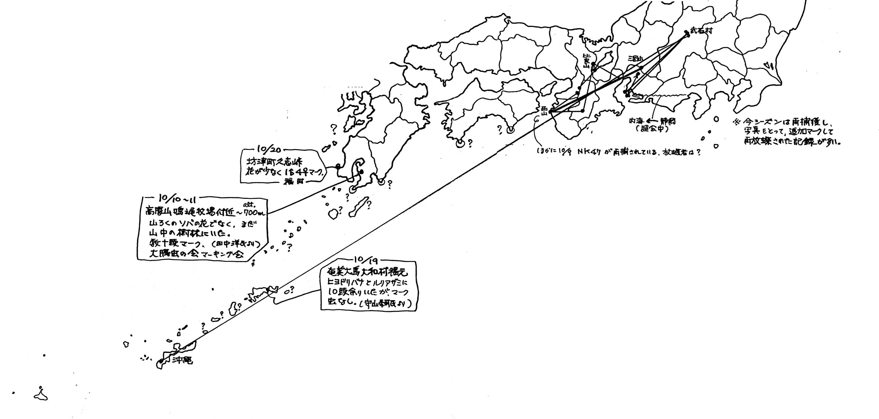「アサギマダラ情報」(大阪:アサギマダラを調べる会)、「ひゃくとりむし」(三重だんごむしの会)、「信州アサギマダラ研究会ニュース」(同会)、およびパソコンの「アサギネット」(藤井恒:くりえいとPEN)からの記録を整理してみた。