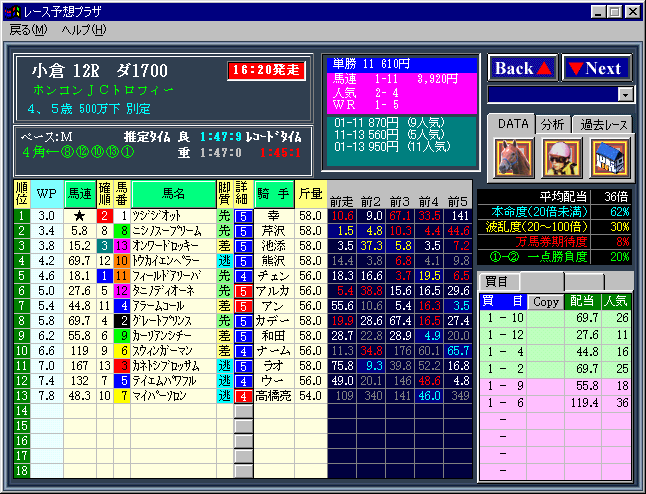 | 期待値を考えると、1-11は18倍なら買えませんが、40倍なら狙える馬券です。 |