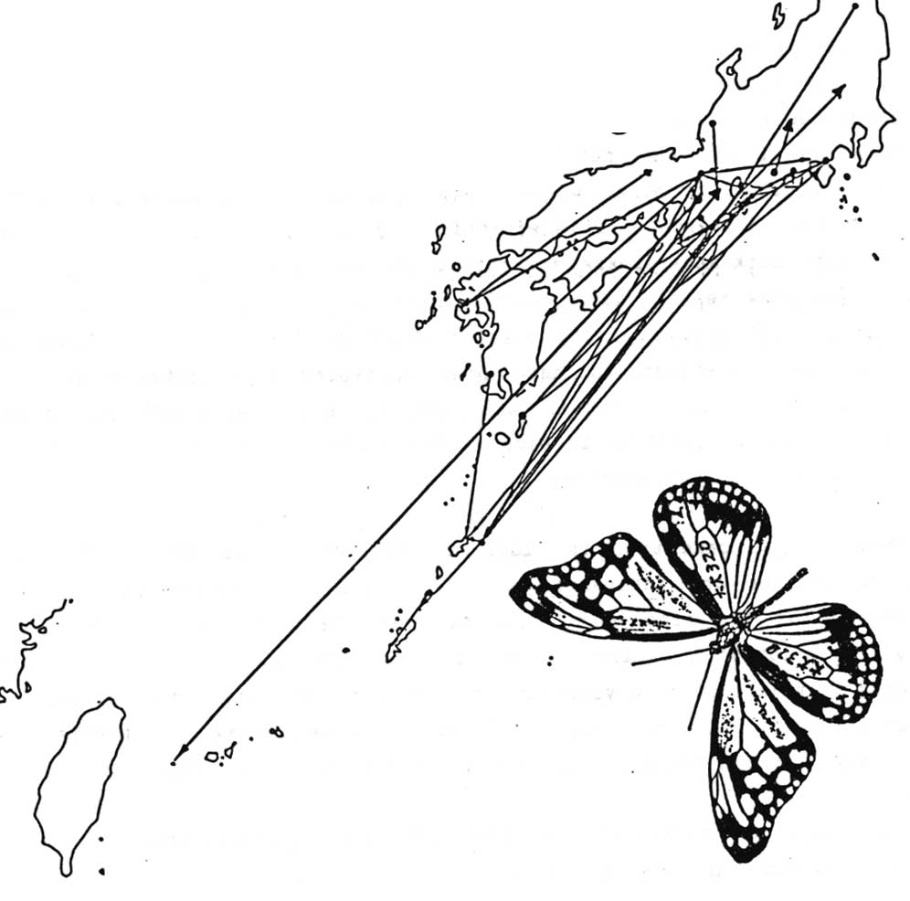 Fig. Confrmed case of travel within the Japanese Archipelago (1981-1996), and an example of a marked butterfly illustrated.