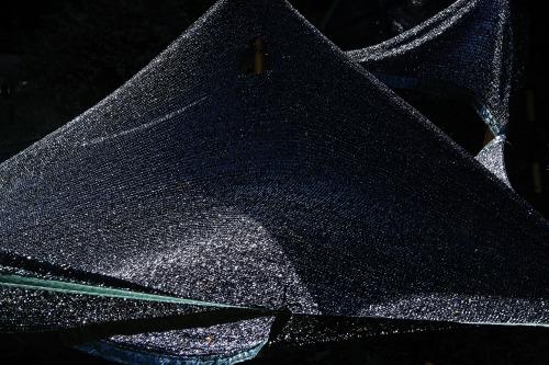 いつもは花菖蒲が植わっている場所ですが黒いネットがかけられていました。苗を強い光から守るためでしょうか。造形的に美しく見えたので、撮ってみました。 |