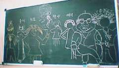 ★左:授業で、みんなのイメージチェンジを考えて、黒板に書きました。1人欠席で、学生が9人+先生1人。★